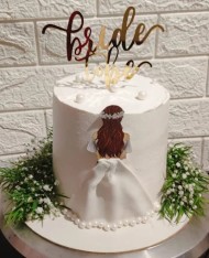 Celebrate the bride’s special moments with our elegant Bride to Be Theme Cake, beautifully designed in a classic white finish. The cake features a delicate bride illustration, pearl detailing at the base, and lush green accents, topped with a stylish “Bride to Be” cake topper that adds charm and sophistication.