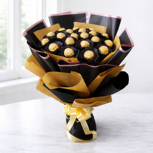 A beautifully crafted bouquet made with 24 Ferrero Rocher chocolates arranged in elegant premium black and gold wrapping.